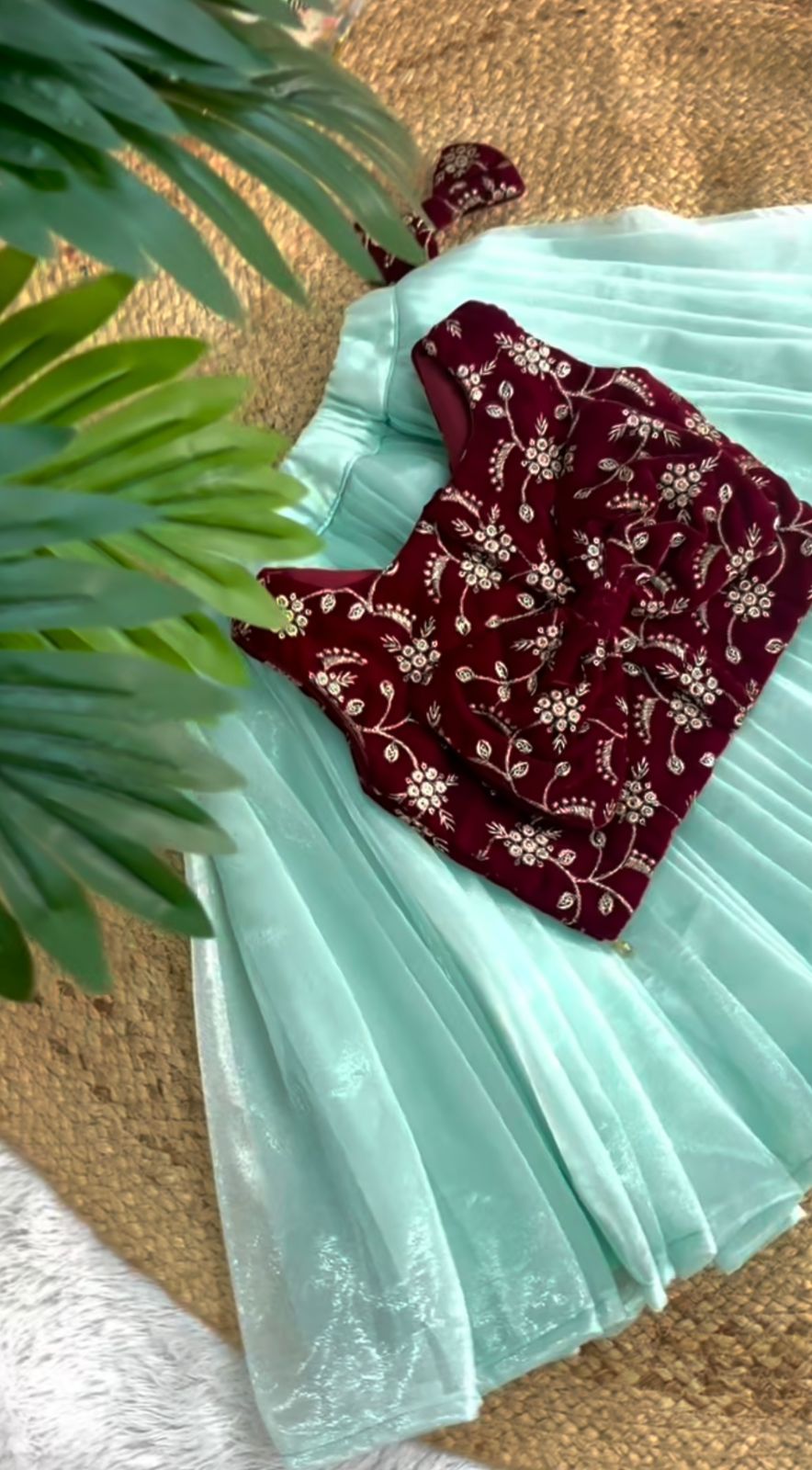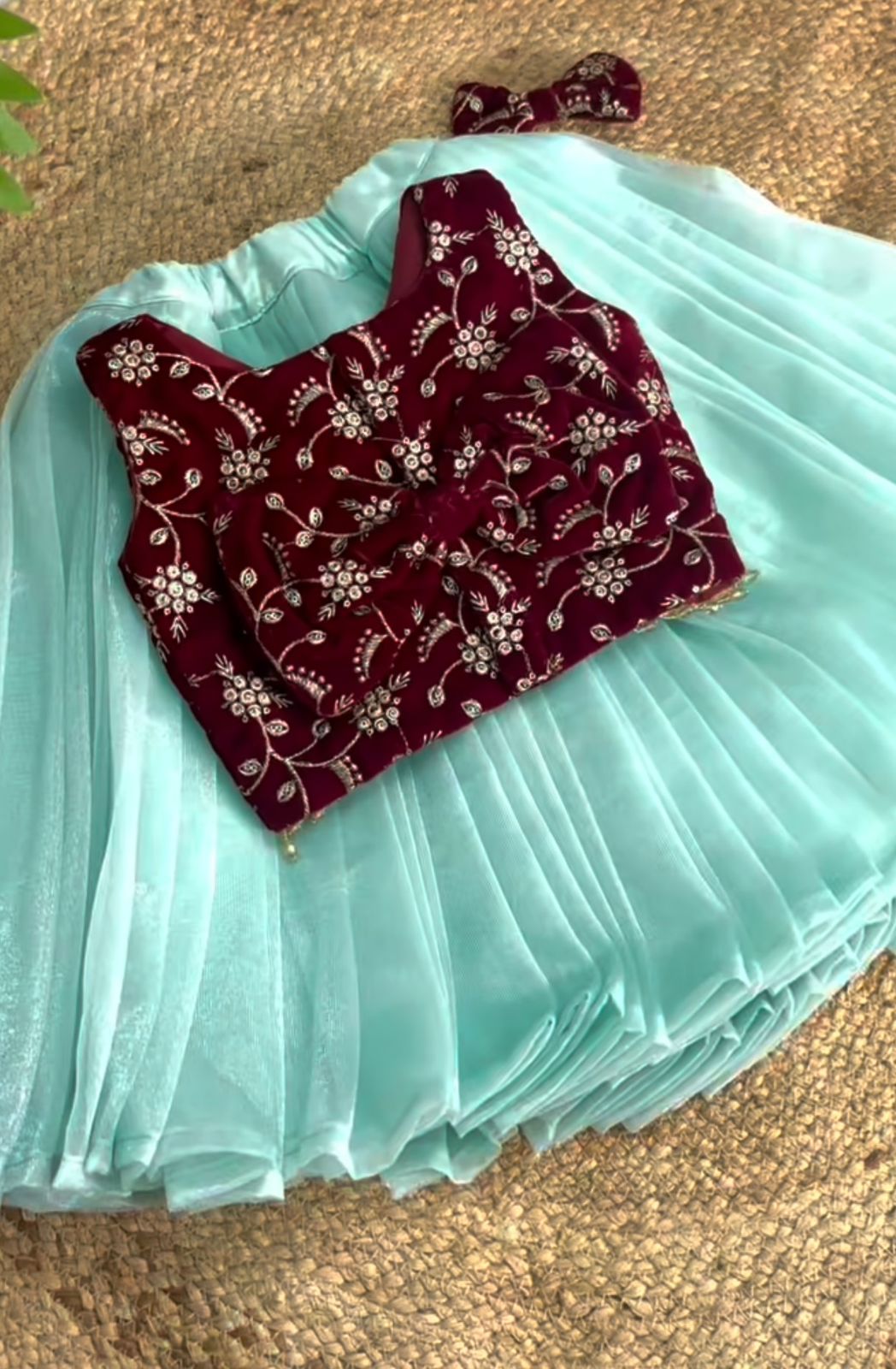 Festive Radiance: Girls' Maroon Velvet Floral Sequinned Top & Sky Twill Net Lehenga Set Festive Radiance: Girls' Maroon Velvet Floral Sequinned Top & Sky Twill Net Lehenga Set